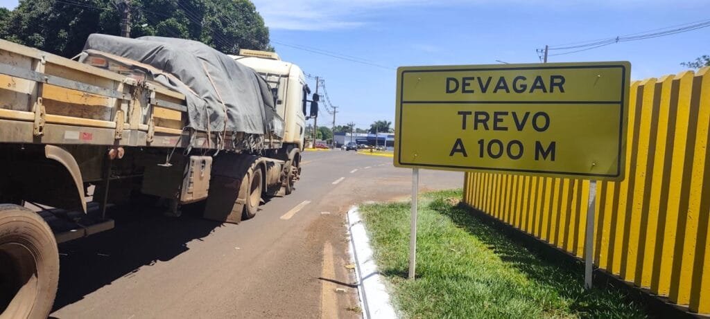 O fluxo de caminhões, principalmente em razão do movimento no Porto Internacional, tem provocado até congestionamento nas vias de acesso e para complicar, havia uma placa indicativa que ficava impedindo bastante a visão de quem fazia a convergência no trevo, via Rua José Biesdorf no sentido norte a Marechal Cândido Rondon.