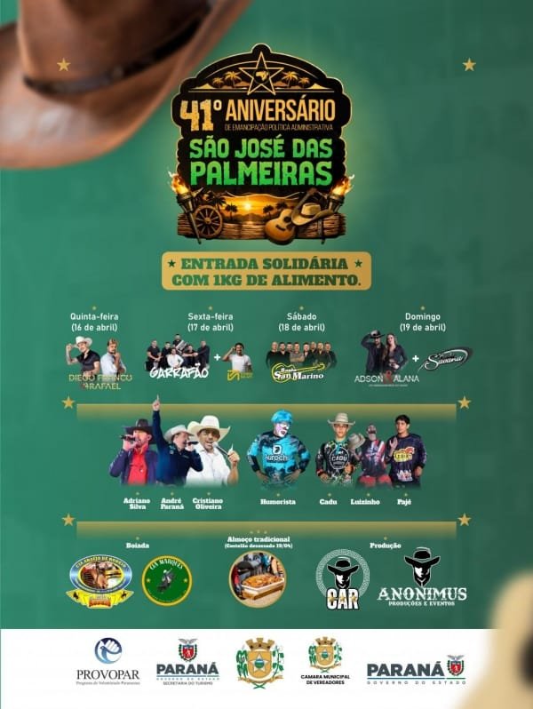 E na agenda da festa dos 41 anos de São José das Palmeiras, Adson e Alana se apresentarão na cidade no domingo (19) às 22h.