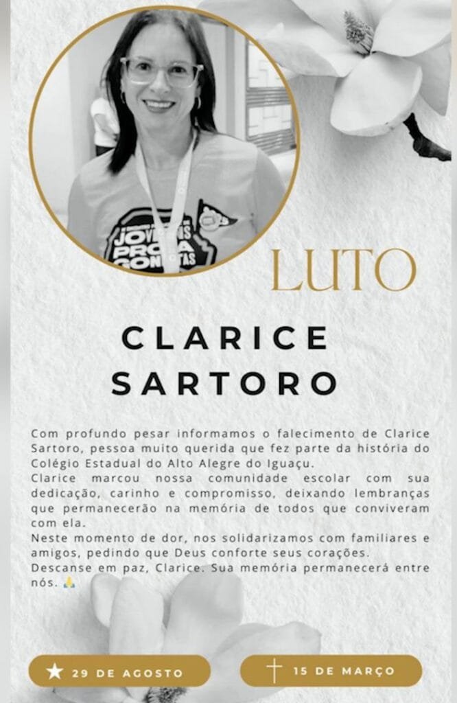 “O Município de Boa Vista da Aparecida recebeu, com profundo pesar, na data de hoje, a notícia do falecimento do Vereador Gilmar Frigo e da servidora municipal Clarice Sartoro Frigo, professora da rede municipal de ensino.