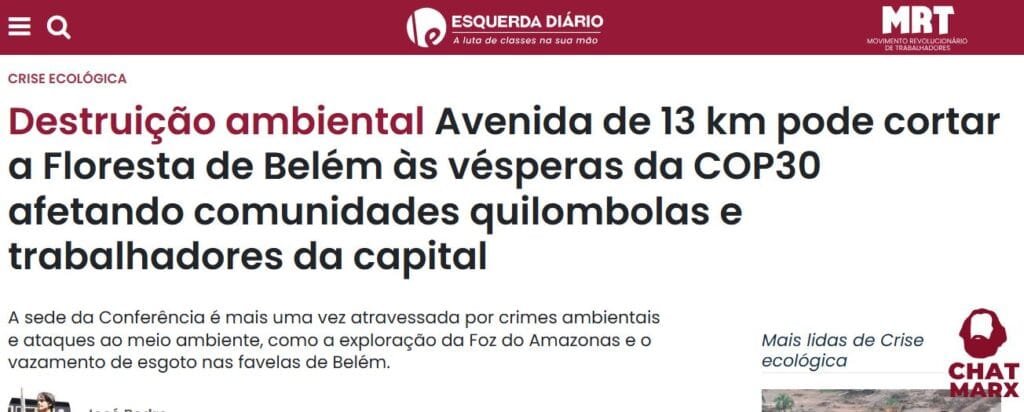 “Destruição ambiental Avenida de 13 km pode cortar (já cortou) a Floresta de Belém às vésperas da COP30 afetando comunidades quilombolas e trabalhadores da capital”