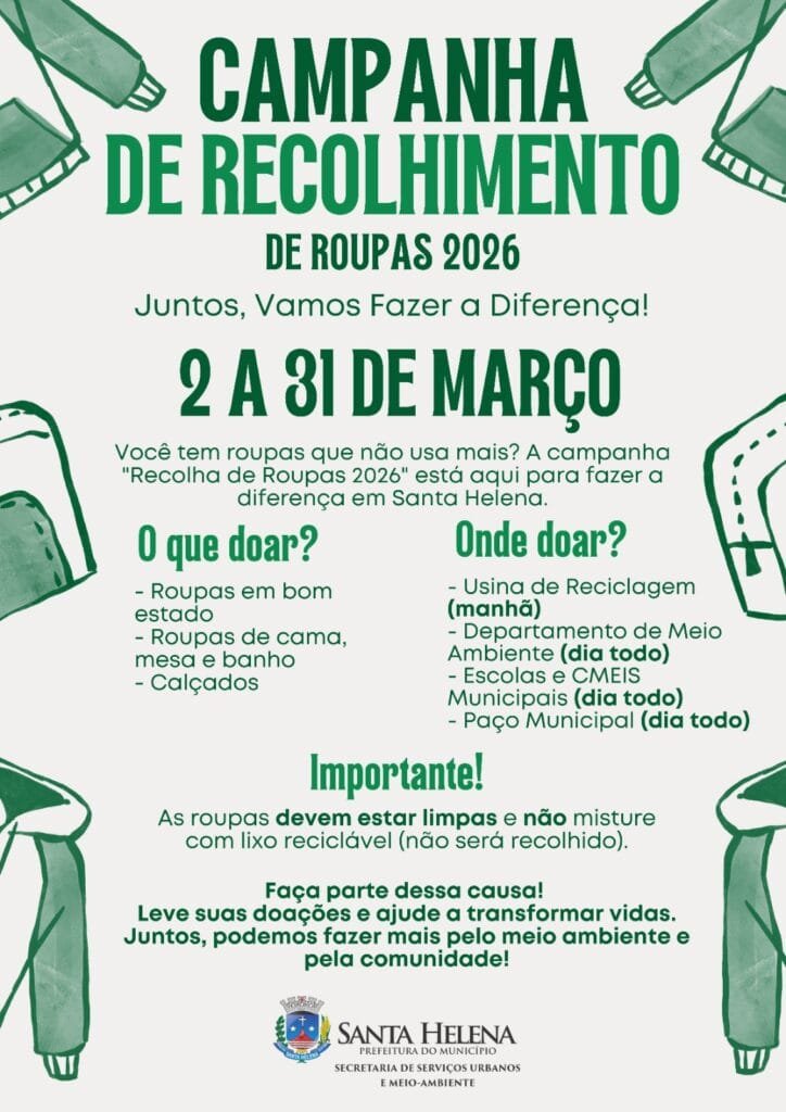 A partir desta segunda-feira (2) está aberta a campanha encabeçada pela Prefeitura de Santa Helena, por meio da Secretaria de Serviços Urbanos e Meio Ambiente, a campanha “Recolha de Roupas 2026”.