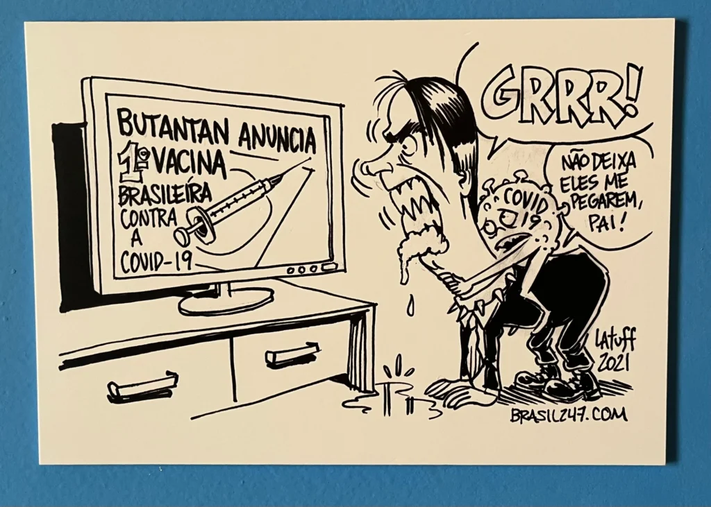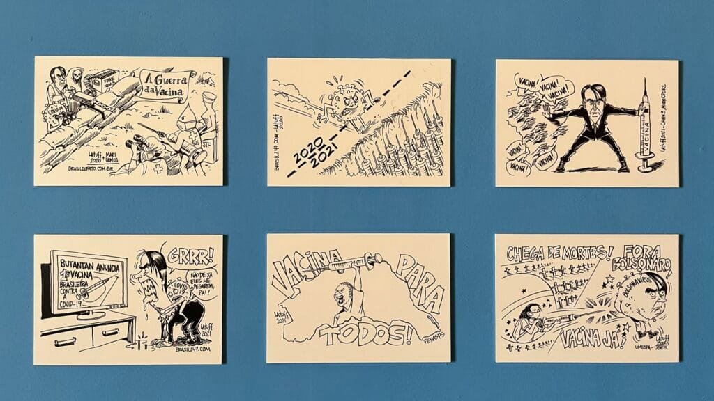 Nitidamente, o foco é no ex-presidente e nelas o cartunista culpa Bolsonaro pelas 700 mil mortes atribuídas ao coronavírus e acusa Bolsonaro de ter impedido a vacinação.