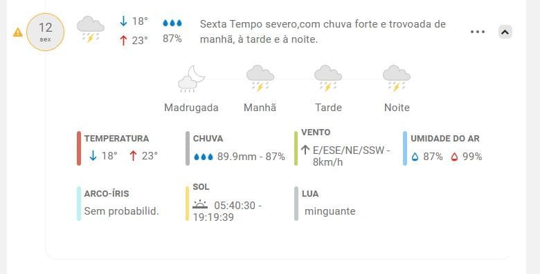 Previsão para sexta-feira, dia 12 é de muita chuva, de acordo com Clima Tempo: