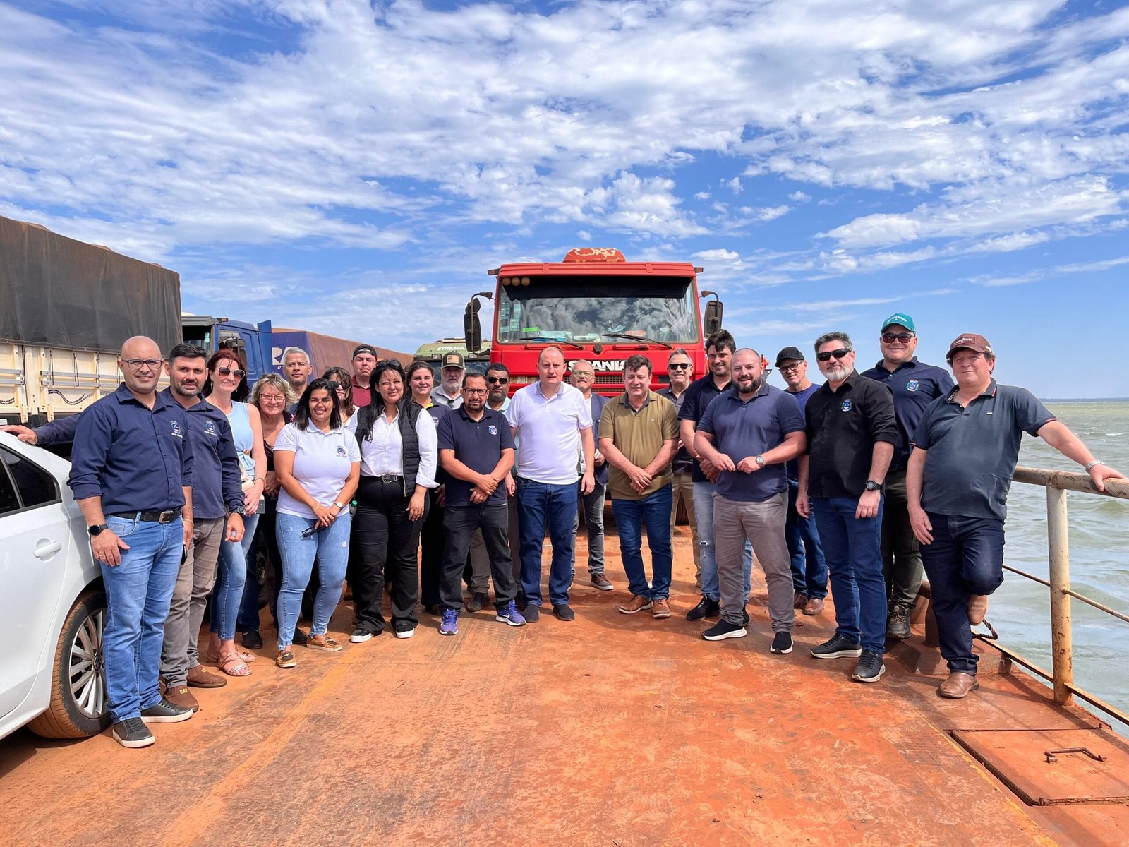 Junto com o prefeito Dinho estava o presidente da Câmara, Anderson (Mu) Draghetti e o ex-prefeito Evandro Zado, além de outros vereadores e servidores da municipalidade, principalmente relacionados ao Porto Internacional de Santa Helena.