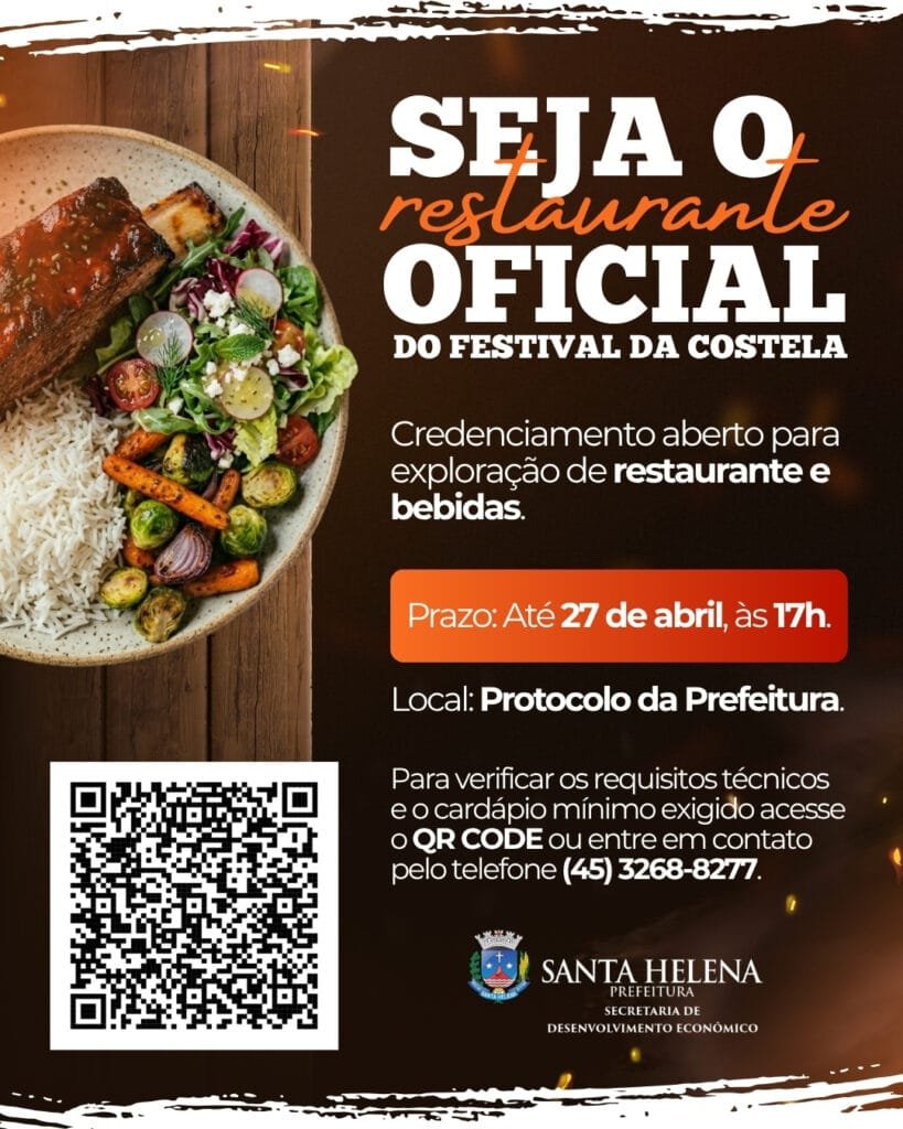 Abre em 4 de maio as inscrições para a 4ª Edição do Festival da Costela Bovina de Santa Helena, evento que integra as festividades do 59º aniversário do município e será realizado no dia 24 de maio, no Balneário Municipal.