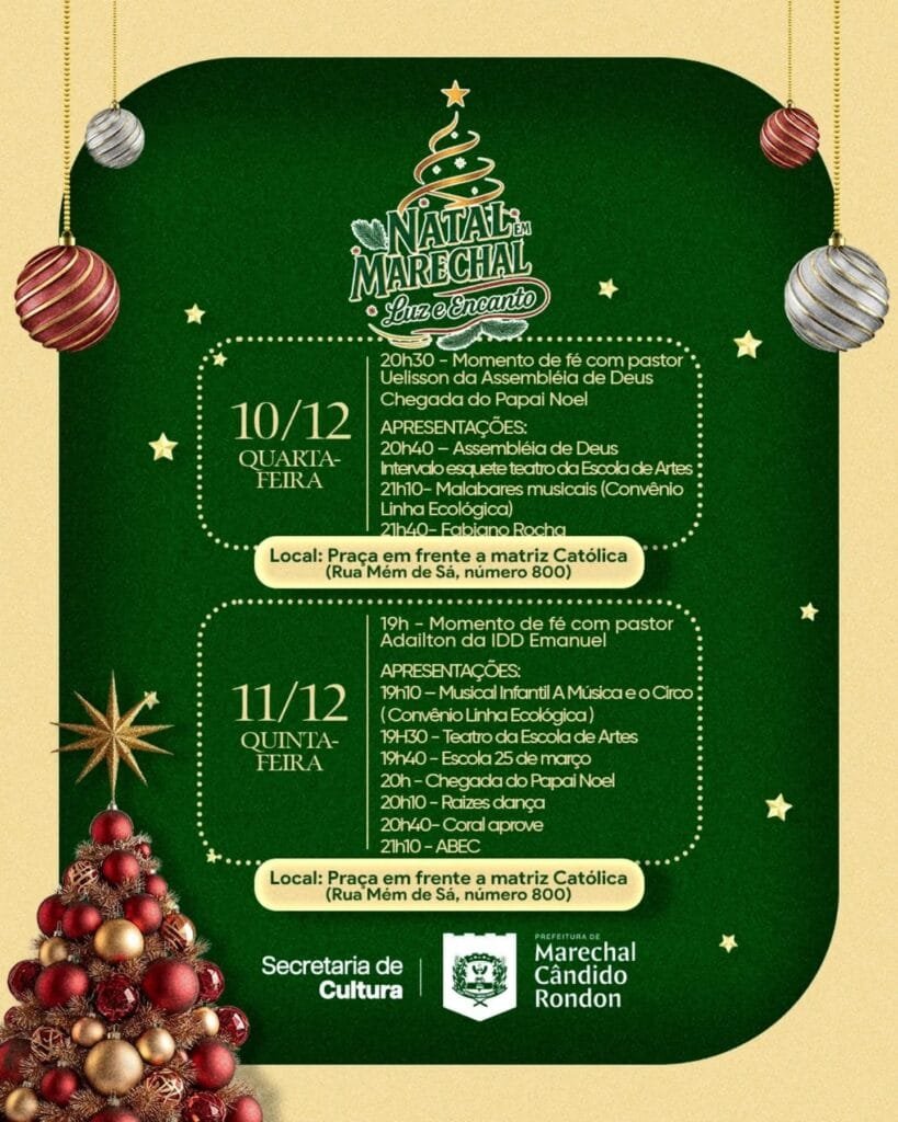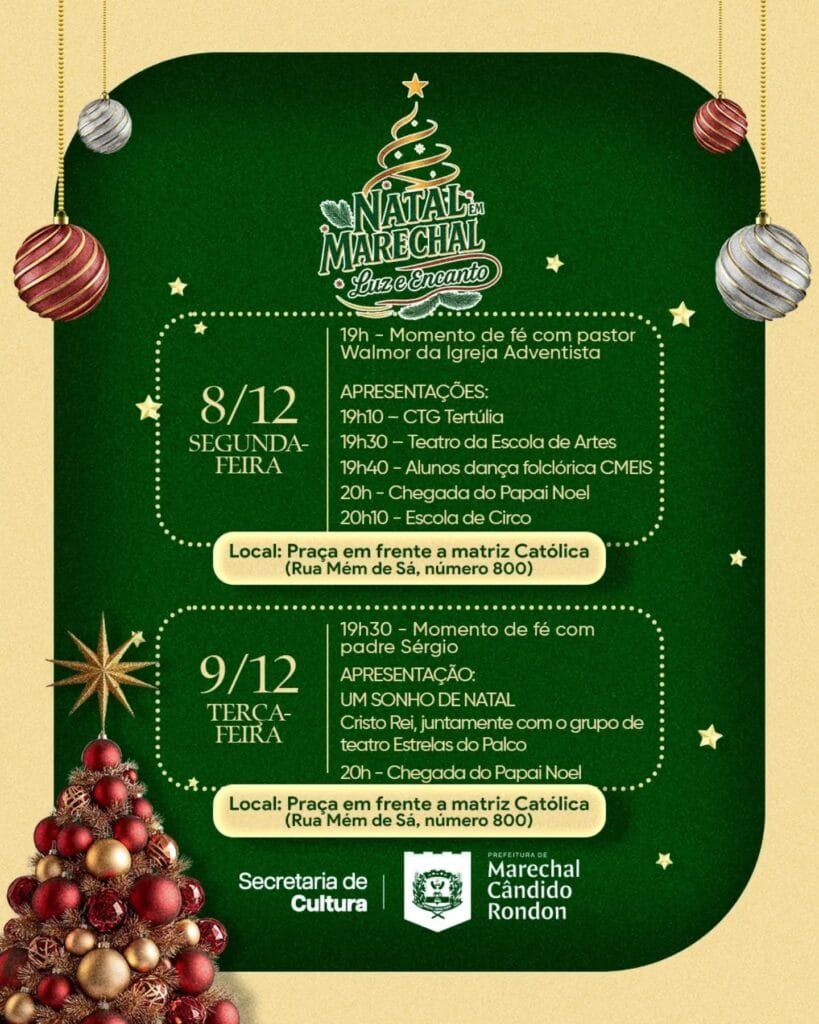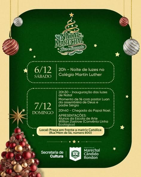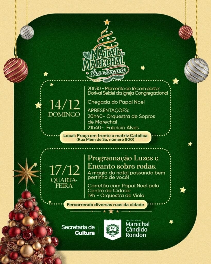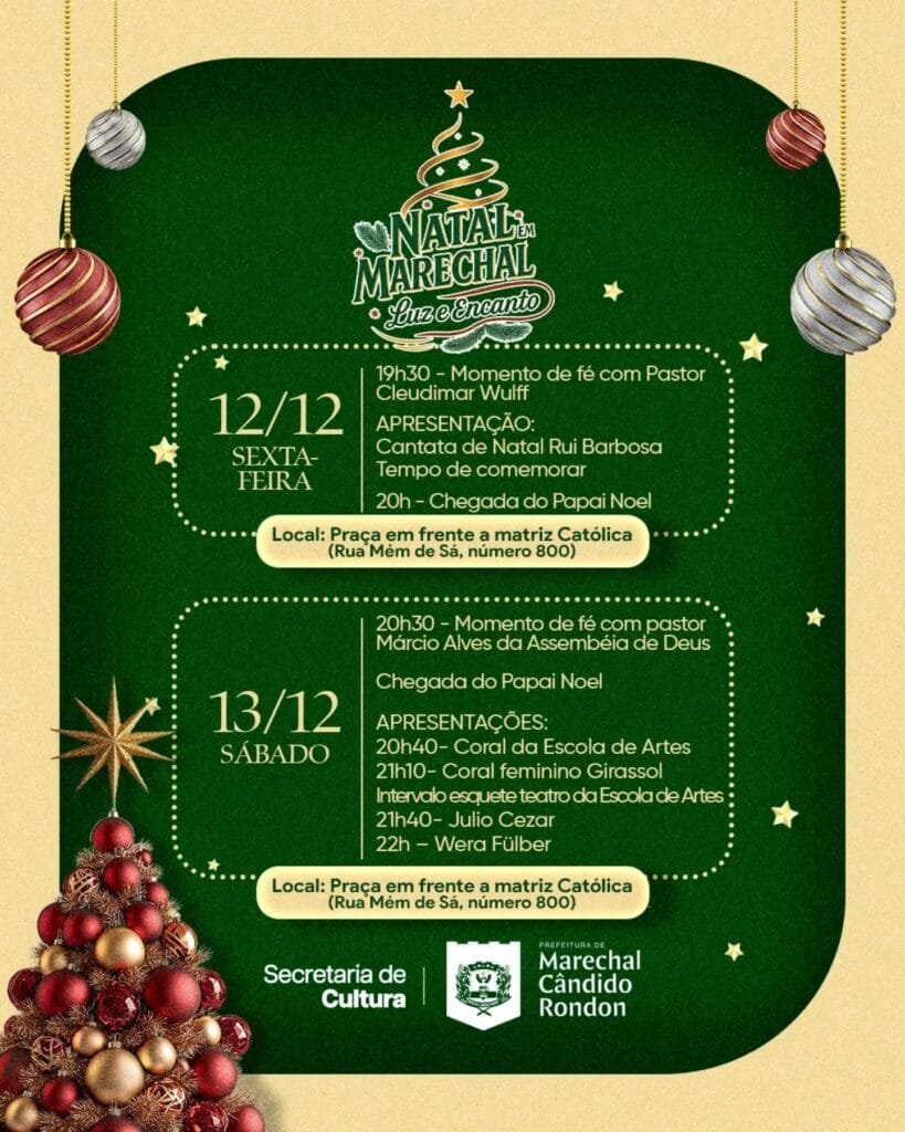 Acontece neste domingo a abertura oficial do “Natal em Marechal – Luz e Encanto”, promovido pela prefeitura rondonese, por meio da Secretaria de Cultura. A solenidade está marcada para às 20h30, na praça em frente à matriz da Igreja Católica, na rua Mem de Sá, 800.