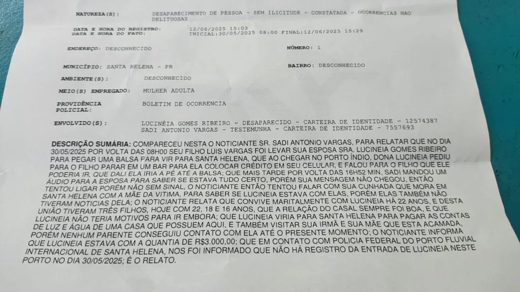 No dia 30 de maio deste ano, Lucinéia Gomes Ribeiro, residente em Mbaracayú, teria sido deixada pelo seu filho no Porto Índio, pois ela iria atravessar o lago para chegar a Santa Helena, via Porto Internacional, onde possuía duas casas, uma alugada e outra que utilizava quando de sua estada na cidade.