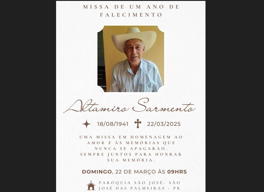 A Família Sarmento presta, junto com toda comunidade de São José das Palmeiras, uma homenagem póstuma a quem deixou um legado de intensa participação na sociedade local e convida a todos para participar da missa em homenagem a Altamiro Sarmento, marcando um ano de seu falecimento.