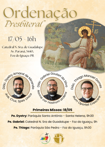 Outros dois diáconos, Gabriel Goulart da Silva e Thiago Manoel Gomes, também serão ordenados sacerdotes durante Santa Missa presidida pelo bispo da Diocese de Foz do Iguaçu, Dom Sérgio de Deus.