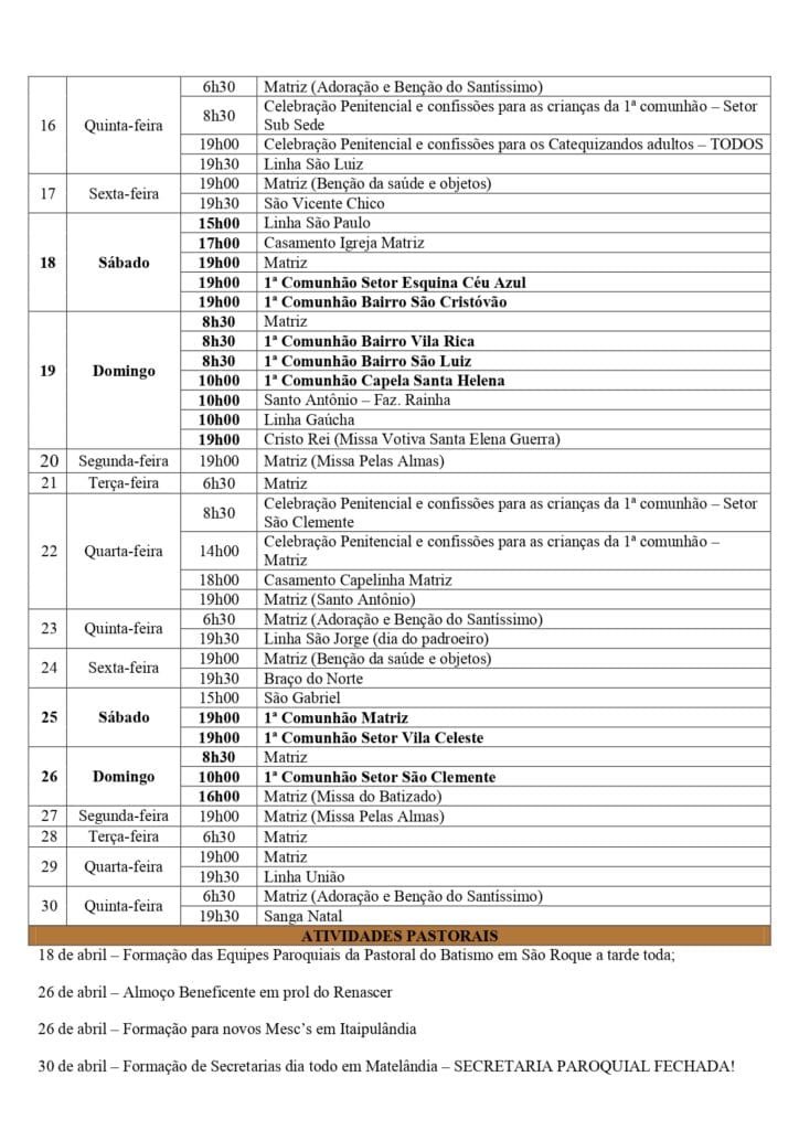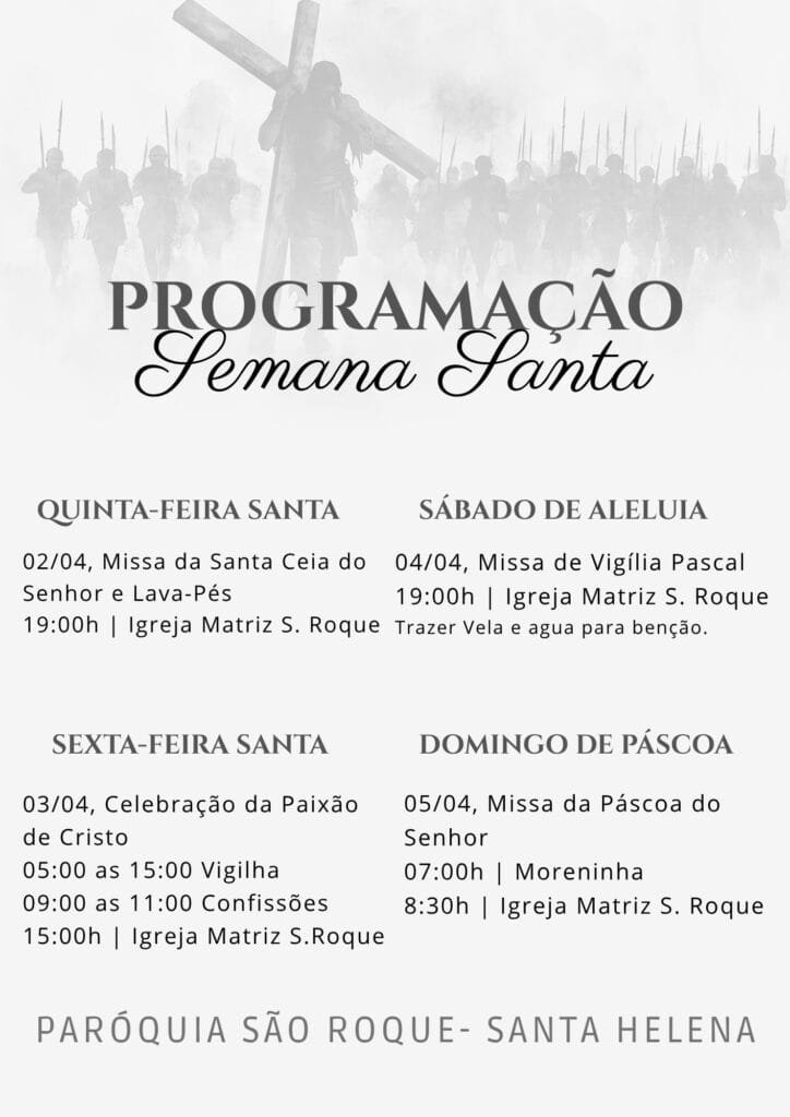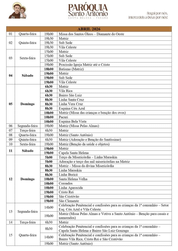 Veja programação completa da Igreja Católica, matriz Santo Antônio de Santa Helena para abril e desta Semana Santa da Paróquia São Roque: (clique para ampliar, clique para retornar)