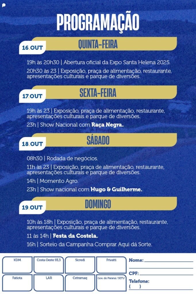A Expo Santa Helena 2025 começa numa nova época, saindo do frio de maio em meio ao aniversário do município, partindo para uma nova experiência de data em meados de outubro, quando a chance de tempo ruim e frio, é menor.