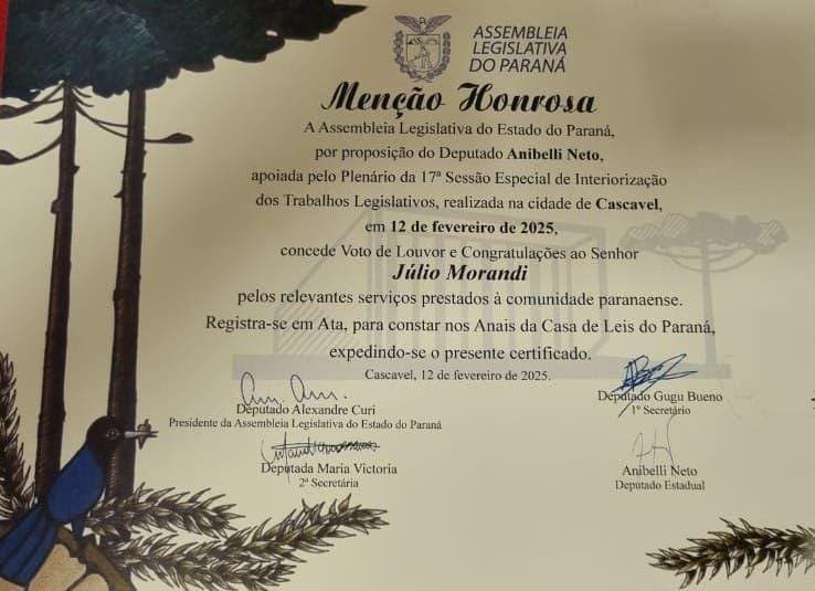 Em fevereiro deste ano, a Assembleia Legislativa do Paraná concedeu ao ex-prefeito Júlio Morandi, em reconhecimento pelos serviços prestados à população de Santa Helena e do Oeste do Paraná, o Certificado Menção Honrosa, durante Sessão itinerante em Cascavel.