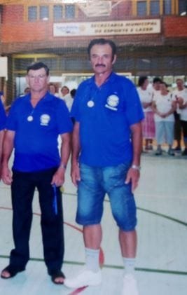 Aqui, “Jorci” numa premiação da bocha, com o falecido prefeito Silom. (Arquivo PMSH)