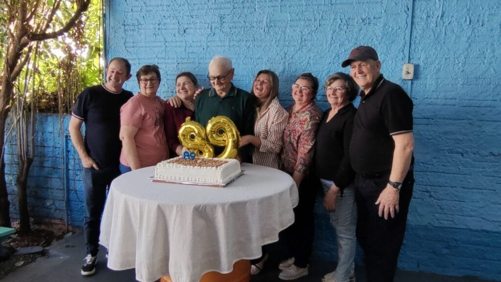 Cattani e filhos Iraci (Nego), Coca, Ivani (Kiko) Ivanete, Ivete, Inocente e Inácio (das esquerda para a direita) em julho deste ano de 2025, por ocasião de seu aniversário (Foto: Elder Boff/FE)