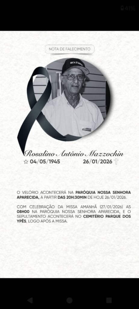 “Nascido em 4 de maio de 1945, Rosalino construiu uma trajetória marcada pelo trabalho, pela fé e pela dignidade, deixando um legado de valores que permanecerá vivo na memória de familiares, amigos e de todos que tiveram o privilégio de conhecê-lo”.