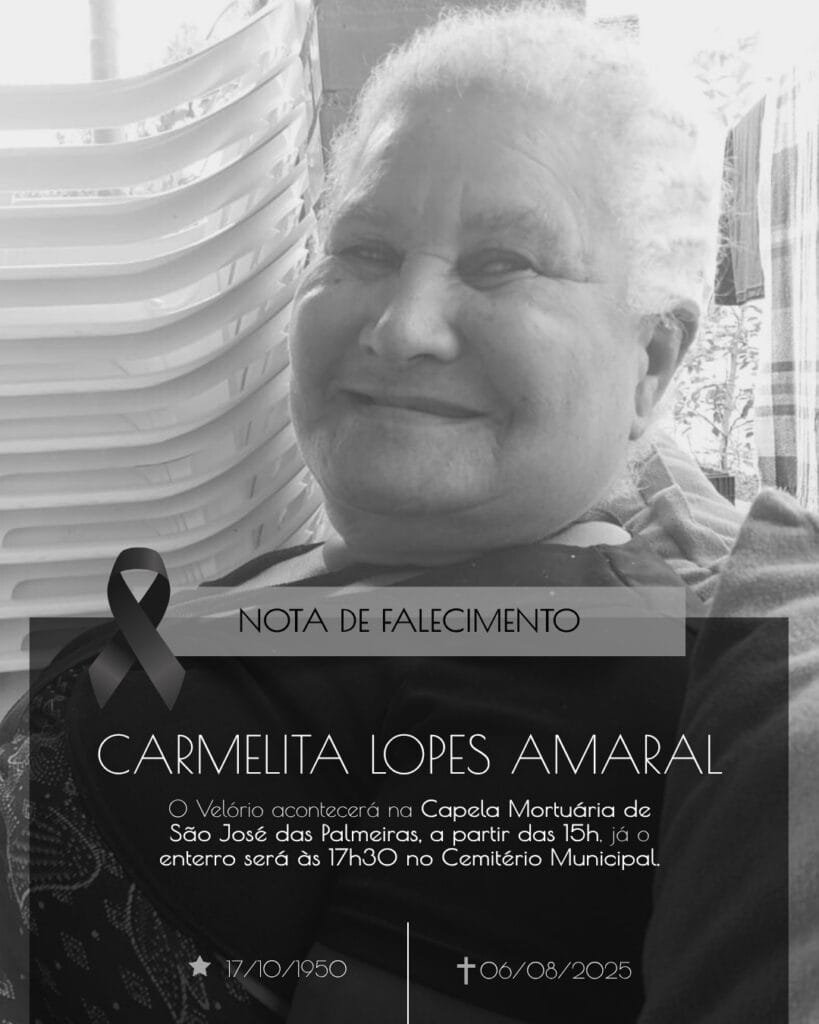 A Funerária Santa Helena e familiares avisam sobre o falecimento de Carmelita Lopes Amaral, aos 74 anos.