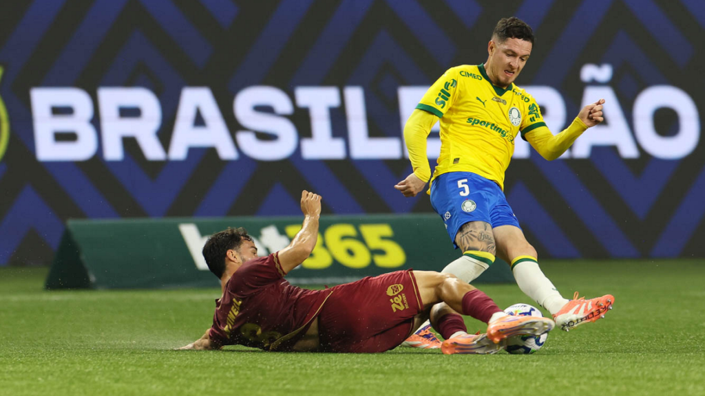 Disputa de bola em Palmeiras x Fluminense, em jogo válido pela 35ª rodada do Brasileirão. A camisa estilho Seleção Brasileira não foi inspiradora para o verdão! (Cesar Greco/Palmeiras)