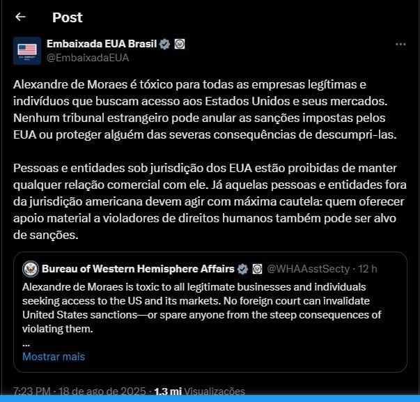 O perfil do Escritório de Assuntos Ocidentais do Departamento de Estado dos EUA chamou o magistrado brasileiro Moraes de “tóxico” e disse que nenhum tribunal estrangeiro pode anular as sanções impostas pelos Estados Unidos, “ou proteger alguém das severas consequências de descumpri-las”, avisa. Em postagem idêntica, traduzida para o português, o perfil oficial da Embaixada dos EUA reproduziu o pronunciamento do governo americano.