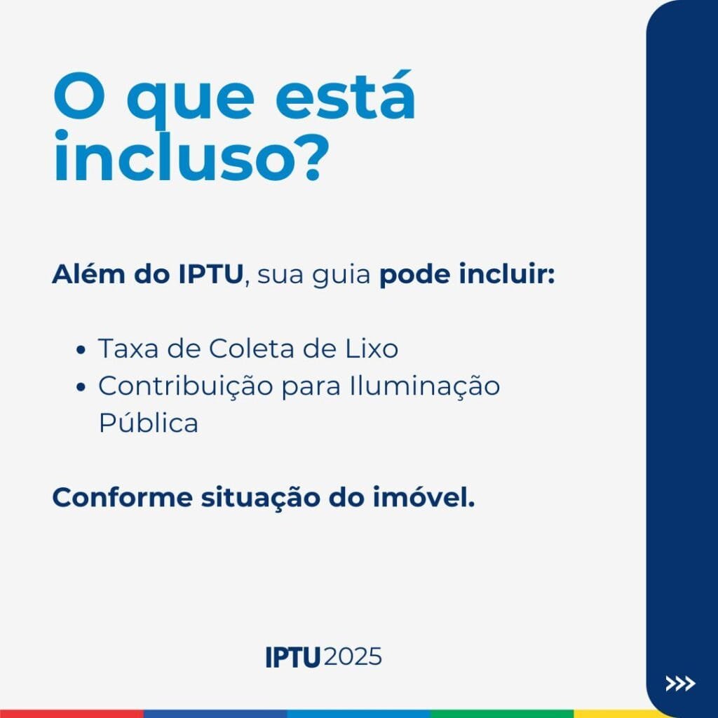 Conforme a situação do imóvel — com ou sem edificação — as guias incluem também os valores referentes à Taxa de Coleta de Lixo e/ou à Contribuição para Custeio da Iluminação Pública.