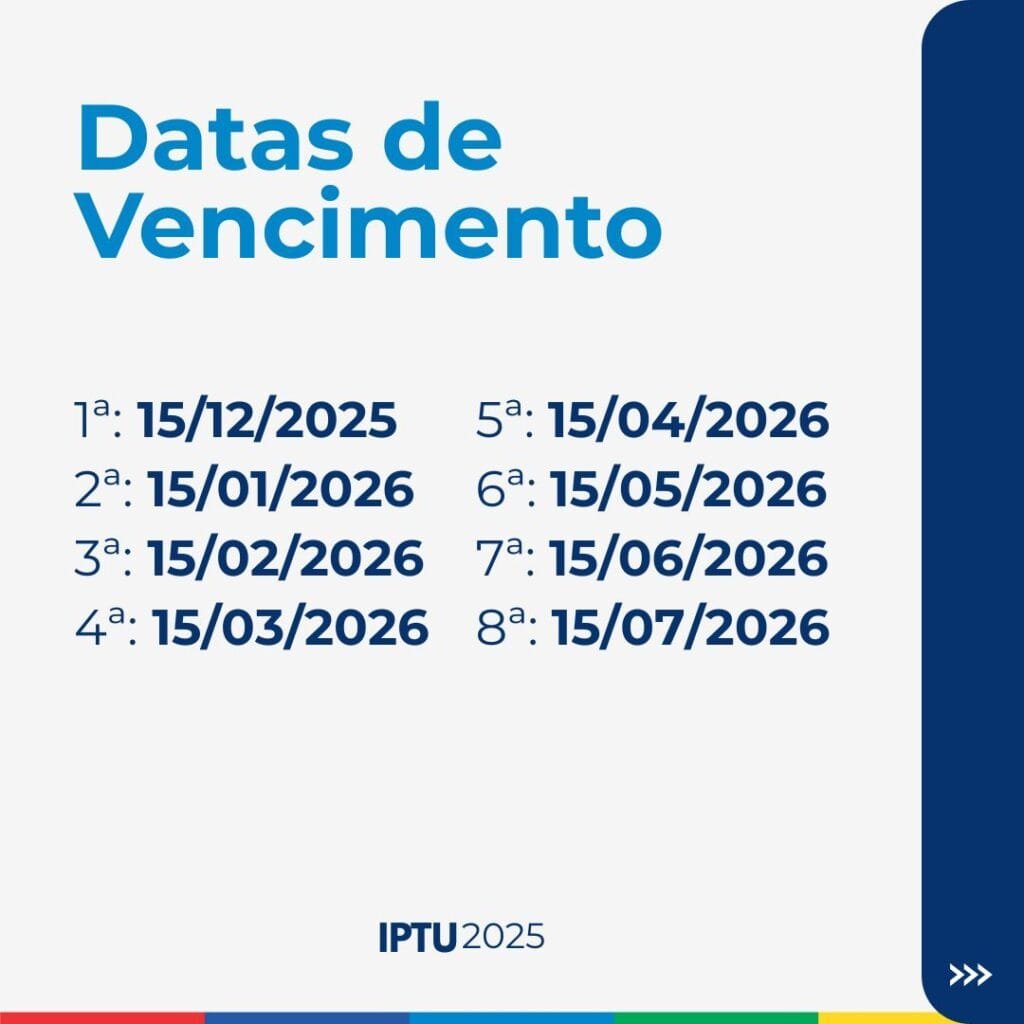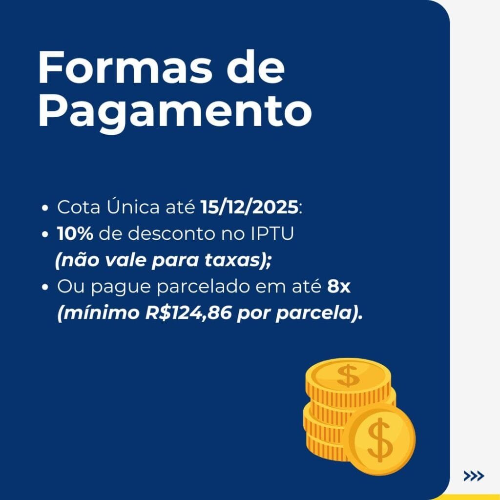 Cota única até 15/12/2025: 10% de desconto sobre o IPTU (não aplicado sobre taxa de lixo ou iluminação).