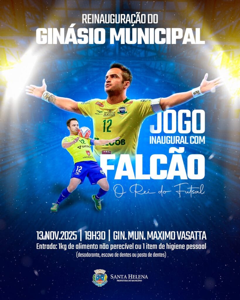 Santa Helena está prestes a viver um momento histórico com a reinauguração do Ginásio Municipal de Esportes Maximo Vasatta, no dia 13 de novembro. A cerimônia acontecerá a partir das 19h30 e contará no jogo inaugural, com a participação de Falcão, o Rei do Futsal do Brasil e o mais destacado atleta mundial na categoria.