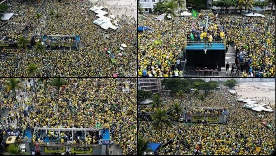 “A PMERJ acompanhou, na manhã deste domingo (16), uma manifestação na orla de Copacabana. O ato, que reuniu mais de 400 mil pessoas, foi monitorado pelo 19BPM, com apoio do 1CPA e COE. Sem registros de ocorrência, a SEPM segue acompanhando a dispersão nos transportes públicos”, diz a PM em nota.