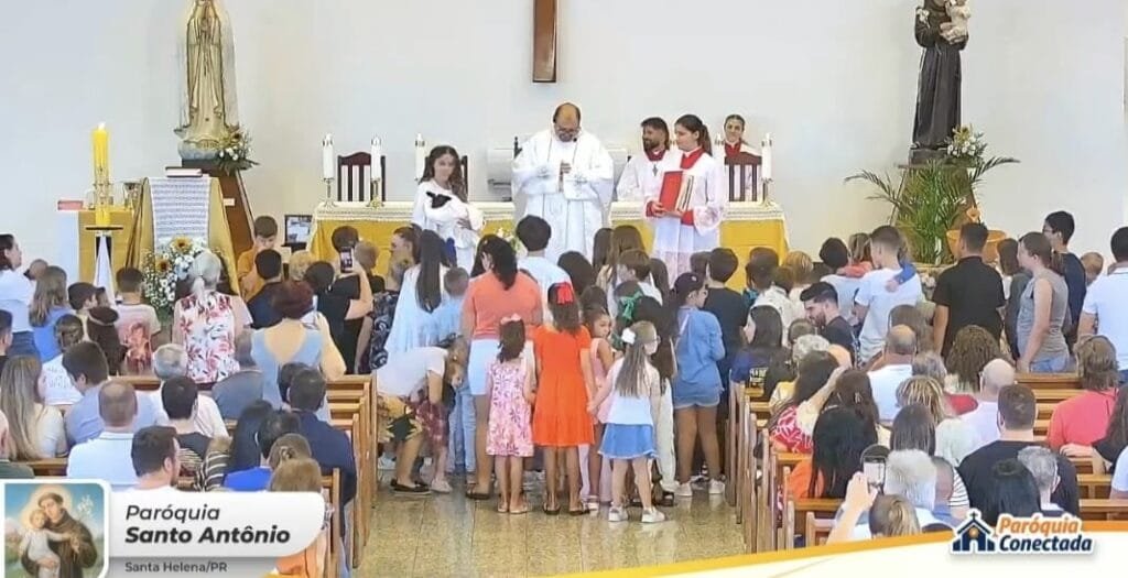 Crianças recebendo mimos e a bênção do sacerdote (Reprodução)