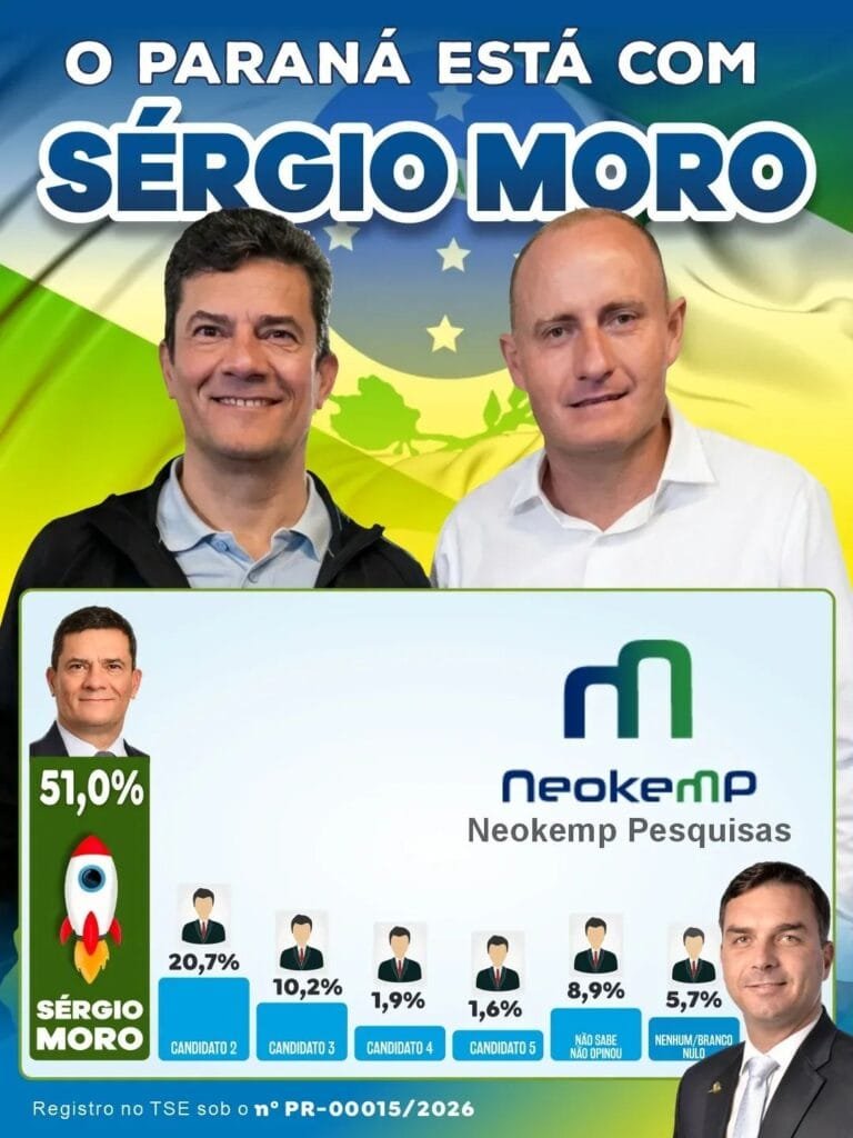O pré-candidato ao governo do Paraná, Sergio Moro (PL), lidera a disputa pelo Palácio Iguaçu nas eleições deste ano. É o que mostra o novo levantamento da Neokemp Pesquisas, divulgado na tarde desta quarta-feira (29). A pesquisa eleitoral ouviu 1.008 pessoas de 27 a 29 de abril, com uma margem de erro de 3,1 pontos percentuais e confiabilidade de 95%. O levantamento para a disputa do Governo do Estado está registrado no Tribunal Superior Eleitoral (TSE) sob o número PR 00015/2026.