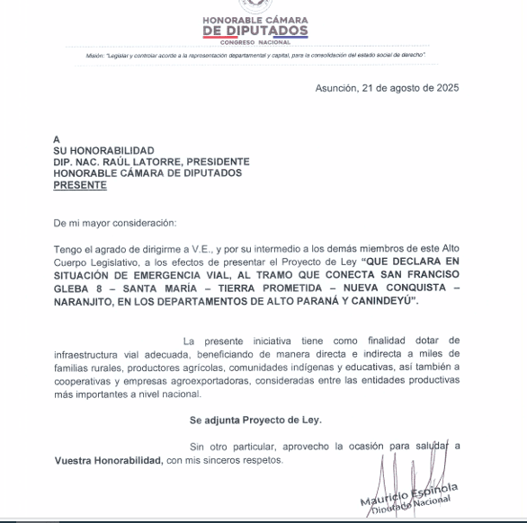 Chegou às mãos de Robson Affonso, um projeto que já começa tramitar no congresso paraguaio, que pede a referida obra (foto abaixo).