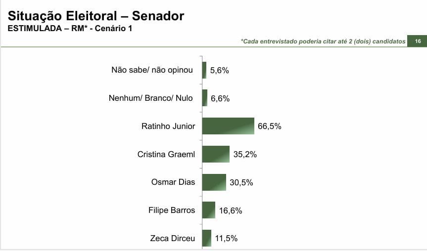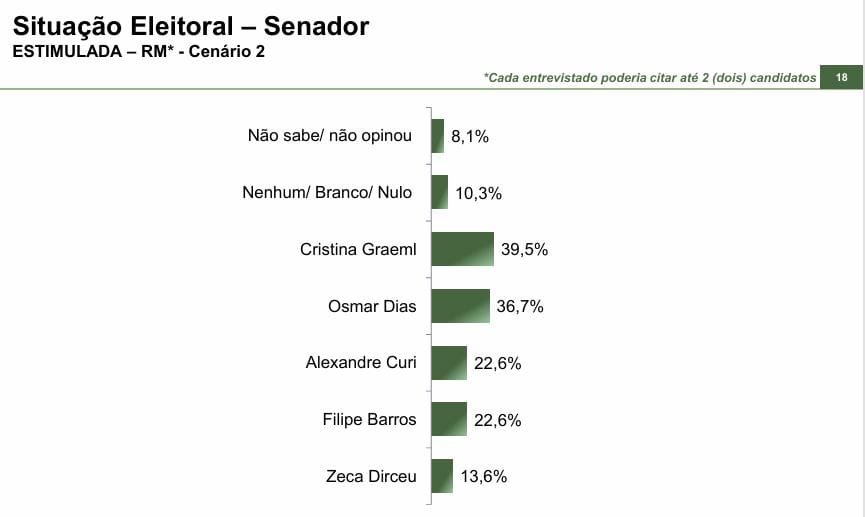 Já para o senado, a jornalista Cristina Graeml lidera quando não aparece Ratinho. Se o governador for colocado na disputa, ele é virtual eleito.