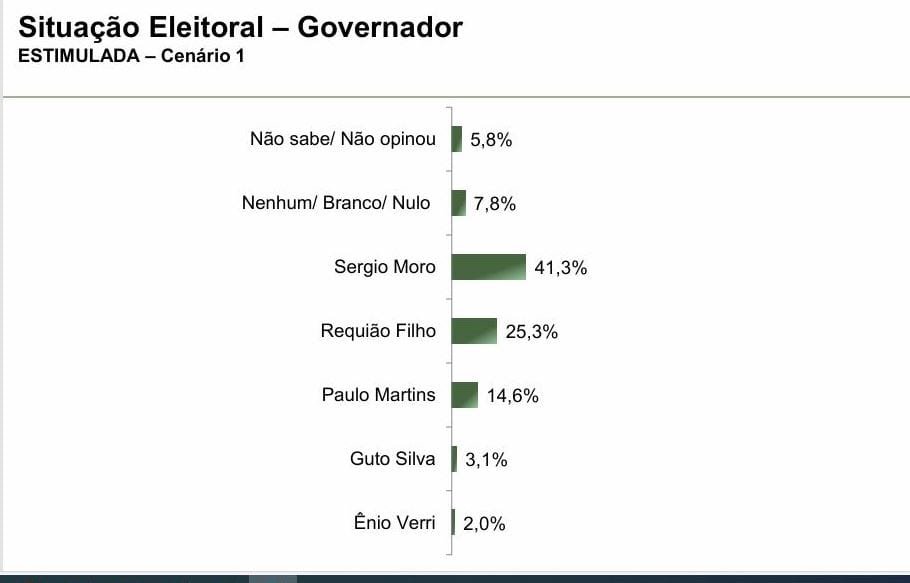 O senador Sergio Moro, ex-juiz da Lava-Jato continua na frente, o que vem se repetindo desde as primeiras sondagens. O deputado estadual Requião Filho aparece isolado na segunda posição.