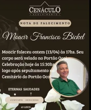 Cenáculo Acolhimento, familiares e amigos, comunicam com pesar, o falecimento de Moacir Francisco Bickel, ocorrido nesta segunda-feira (13), às 17h aos 49 anos, vítima de uma descarga elétrica.