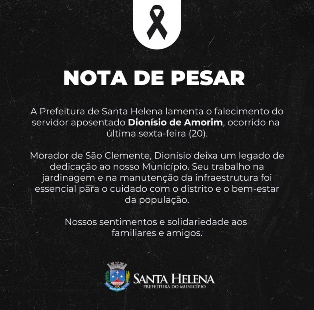 A Prefeitura de Santa Helena, PR, divulgou um comunicado neste sábado, lamentando o falecimento do servidor aposentado Dionísio de Amorim, ocorrido na sexta-feira (20).