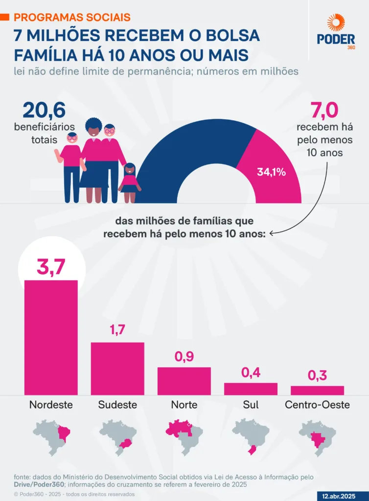 Das 20,6 milhões de famílias inscritas no Bolsa Família, 7 milhões recebem dinheiro do programa há 10 anos ou mais, com dados de fevereiro de 2025.