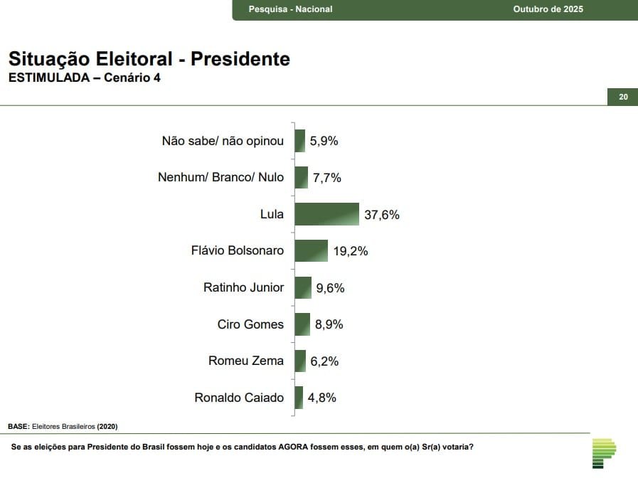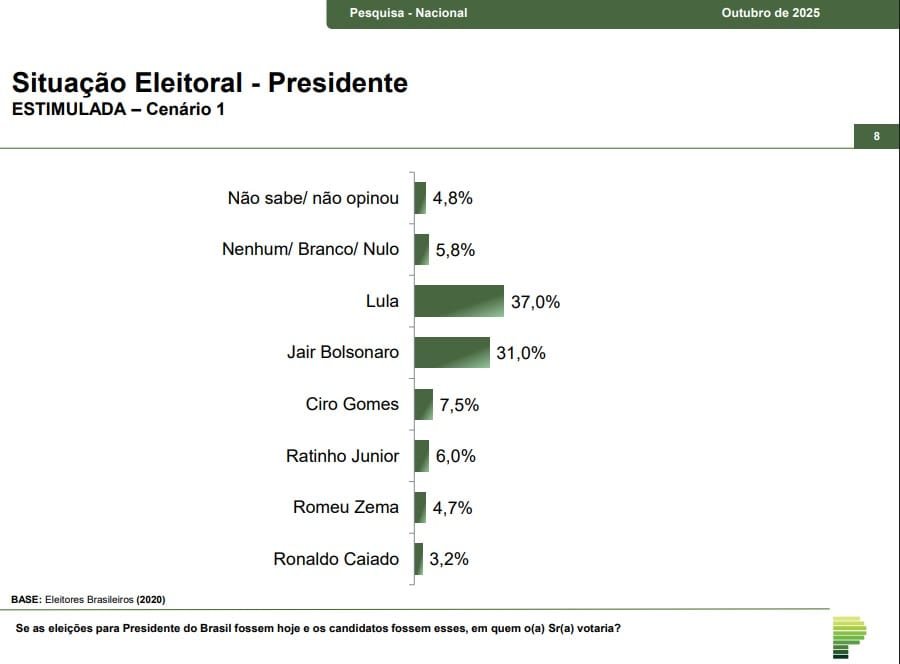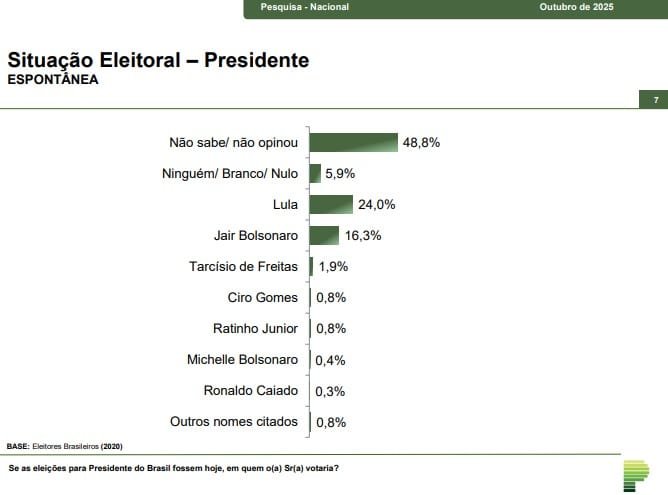Levantamento do Paraná Pesquisas divulgado nesta segunda-feira (27) mostra vantagem do presidente Lula (PT) sobre o ex-presidente Jair Bolsonaro (PL). No cenário espontâneo, quando o entrevistado responde livremente em quem gostaria de votar, Lula soma 24%, contra 16,3% de Jair Bolsonaro.