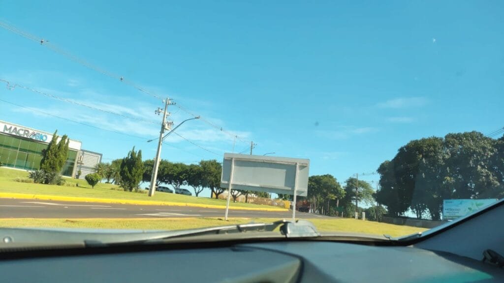Uma placa localizada num canteiro do trevo de acesso sul da cidade está causando transtornos a motoristas de caminhão, atrapalhando a visão para quem precisa fazer o contorno sentido Marechal Cândido Rondon.