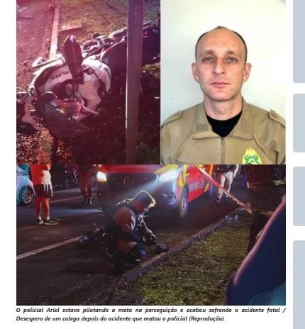 O policial Ariel Julio Rubenich, de 34 anos, que estava perseguindo um motorista com ficha por homicídio, tráfico e outros e sofreu um acidente, perdendo a vida instantaneamente, diante do desespero de outros colegas de farda.