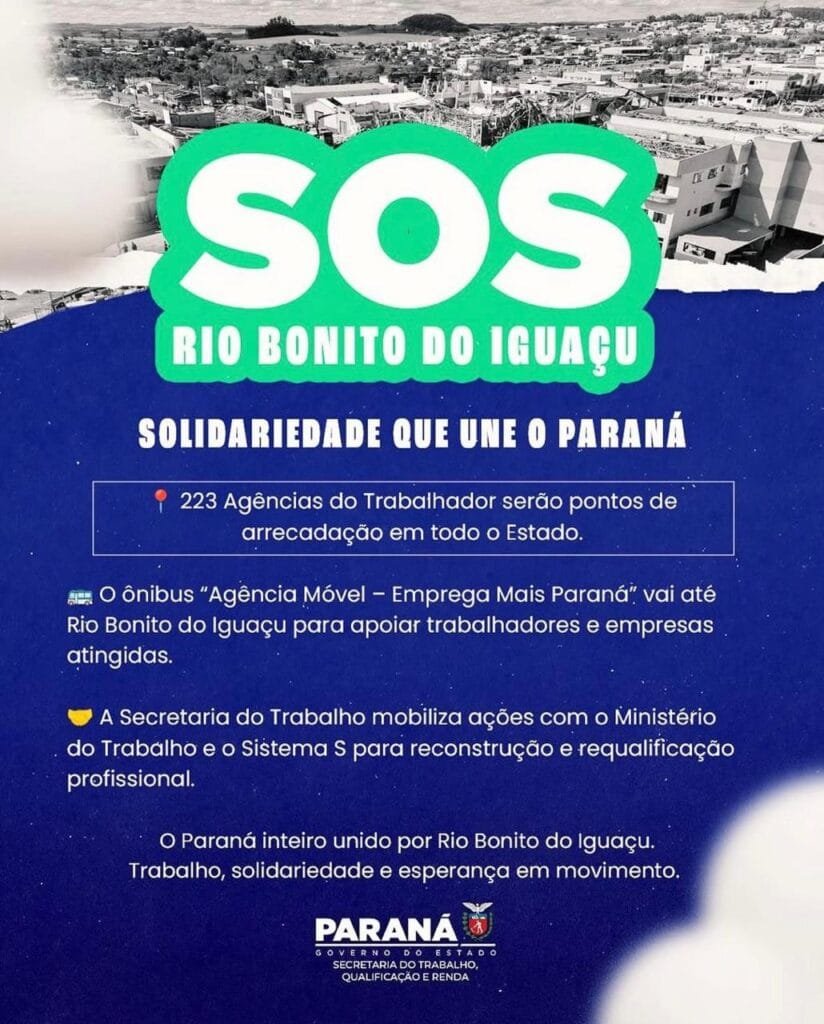 A Secretaria do Trabalho, Qualificação e Renda do Paraná está coordenando uma ampla ação de apoio às famílias, trabalhadores e empresários de Rio Bonito do Iguaçu, após o tornado de categoria EF3 que atingiu o município.