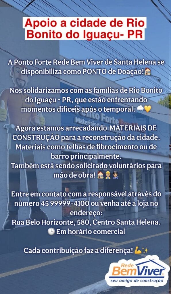 Empresas como as da Rede Bem Viver, estão se mobilizando na arrecadação de materiais de construção. De Santa Helena deve partir uma carreta ainda nesta semana, carregada com materiais para reconstruir a cidade de Rio Bonito do Iguaçu.