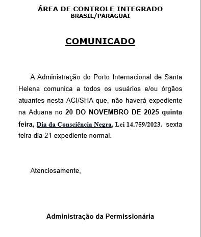 • Por causa do Dia da Consciência Negra, feriado nacional nesta quinta, não tem balsa na travessia BR/PY
