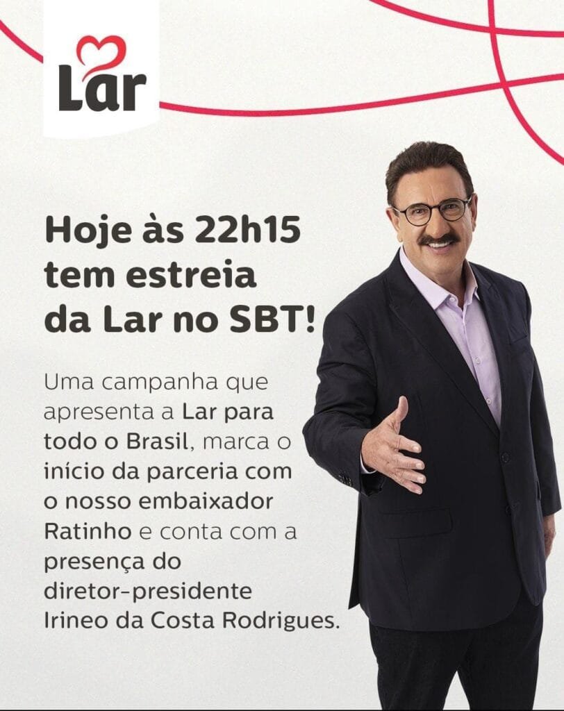 Hoje no Programa do Ratinho pelo SBT, presença do diretor presidente da Lar Cooperativa Agroindustrial, para o lançamento de uma campanha de mídia, que firmará ainda a marca já conhecida no Brasil e no exterior.
