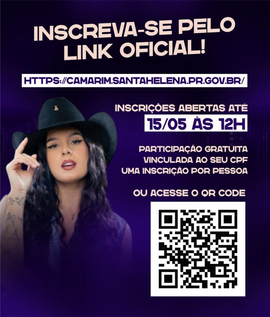 As inscrições são gratuitas e realizadas exclusivamente pelo link camarim.santahelena.pr.gov.br, com prazo até as 12h do dia 15 de maio de 2026. A participação é vinculada ao CPF do inscrito e limitada a uma inscrição por pessoa. Será permitido participar pessoas com, no mínimo, 4 anos completos até a data do evento.
