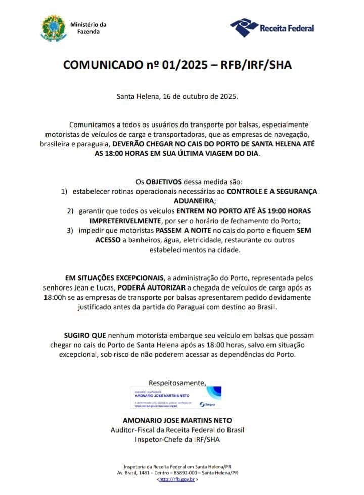 O comunicado (veja abaixo) foi assinado por Amonario Jose Martins Neto, auditor-fiscal da Receita Federal do Brasil, inspetor-chefe em Santa Helena.