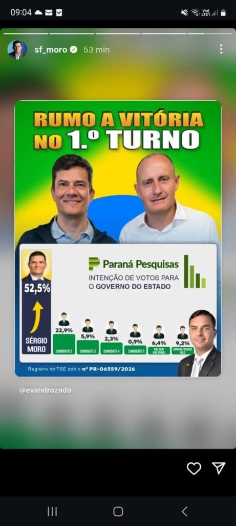 Até aí, tudo bem, Zado fazendo a sua parte, repercutindo esta notícia muito positiva para o seu pré-candidato ao governo do Paraná. Mas, o interessante é o “repost” de Moro, que ainda na manhã de segunda-feira, publicou em seu Instagram, a mesma postagem ao lado de Zado.