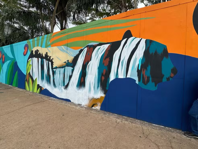 O artista carioca Igor Izzi produziu um mural que será inaugurado oficialmente nesta sexta-feira (28). Fica localizado na aduana brasileira da ponte, ponto de passagem dos pedestres que saem de Foz do Iguaçu rumo ao país vizinho.
