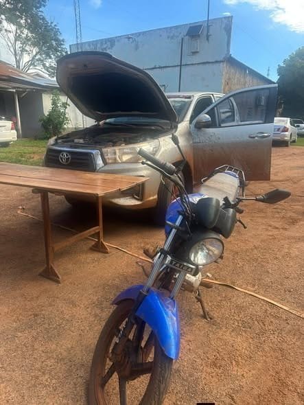Na operação foram apreendidos uma picape da marca Toyota, modelo Hilux, cor prata, ano 2020, sem placa, bem como uma motocicleta da marca Kenton, modelo TL 150 Eclipse, cor azul.
