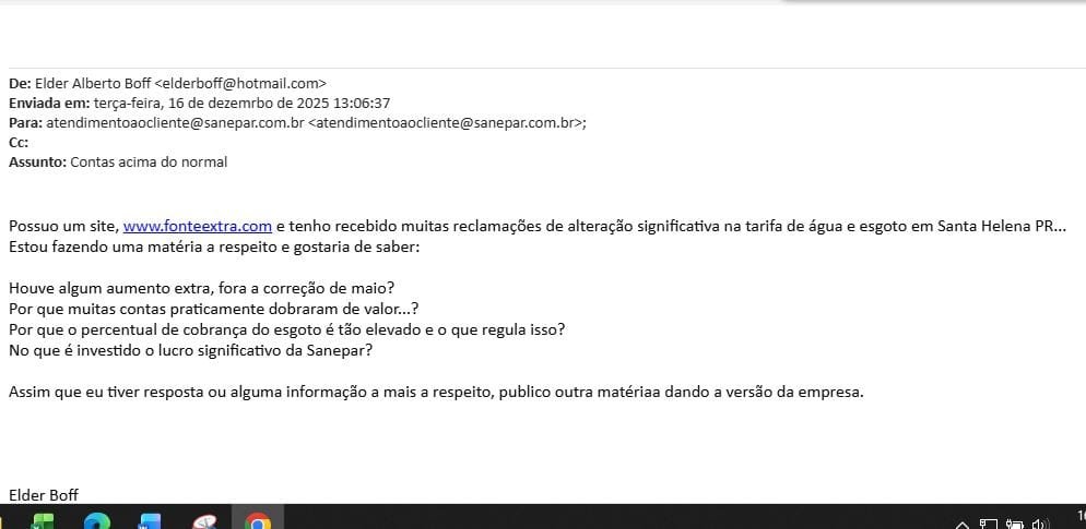 Como versou o e-mail da empresa, quem tiver alguma queixa a respeito do “estouro” da conta de água, poderá enviar aos canais de contato contidos na conta de água, os seguintes dados: