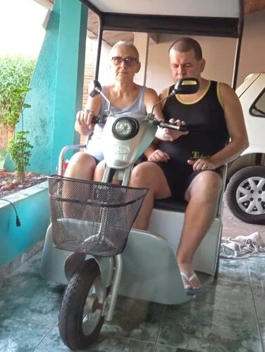 A vida me apresentou muitos desafios, mas também grandes bênçãos. Uma delas é minha esposa, minha companheira de vida e de luta, que me apoia em tudo — inclusive na música. No entanto, ela enfrentou sérios problemas de saúde nos últimos tempos, com complicações no coração e na coluna. Para cuidar dela e ajudá-la no tratamento, vendi meus equipamentos de som e com muita ajuda fizemos um grande progresso conseguindo um veículo adaptado: uma moto com três rodas, personalizada para nossas necessidades.