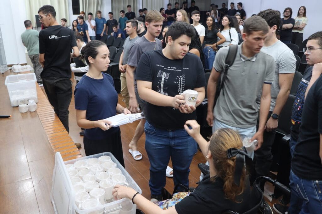 Na sequência, a participação da Comissão UTFPR Sustentável. Como parte da sensibilização sobre a gestão de resíduos, foram entregues canecas oficiais aos calouros, reforçando a campanha Copo Zero. A iniciativa visa eliminar o uso de copos descartáveis no campus, incentivando hábitos de consumo consciente desde o primeiro dia de aula.