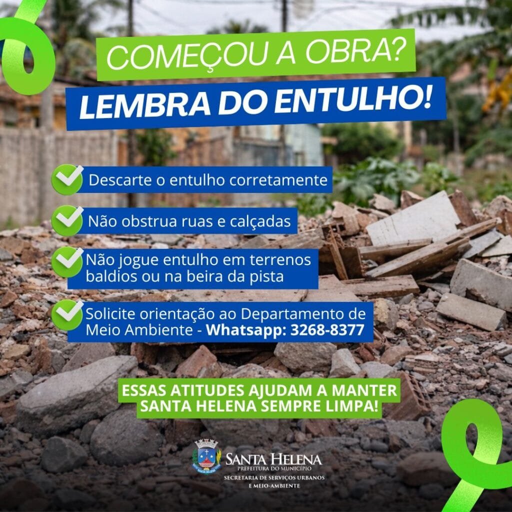 Pensando nisso, a prefeitura de Santa Helena, por meio da Secretaria de Serviços Urbanos e Meio Ambiente, reforça a importância do descarte correto de entulhos provenientes de obras, reformas e construções. A destinação irregular de resíduos compromete a limpeza urbana, prejudica o meio ambiente e pode causar transtornos à população, como obstrução de ruas, calçadas e sistemas de drenagem.
